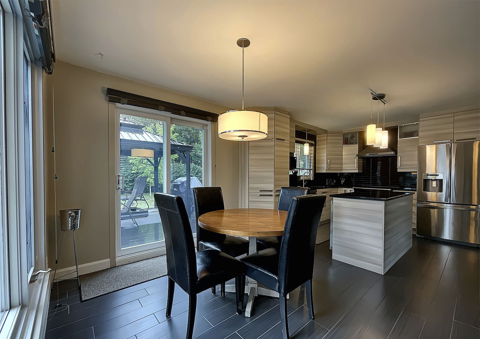 La cour arrière clôturée, orientée nord, est bordée d'une haie mature assurant une belle intimité. Elle comprend deux cabanons, une grande terrasse 16x16 avec gazebo et offre suffisamment d'espace pour l'ajout d'une piscine.
