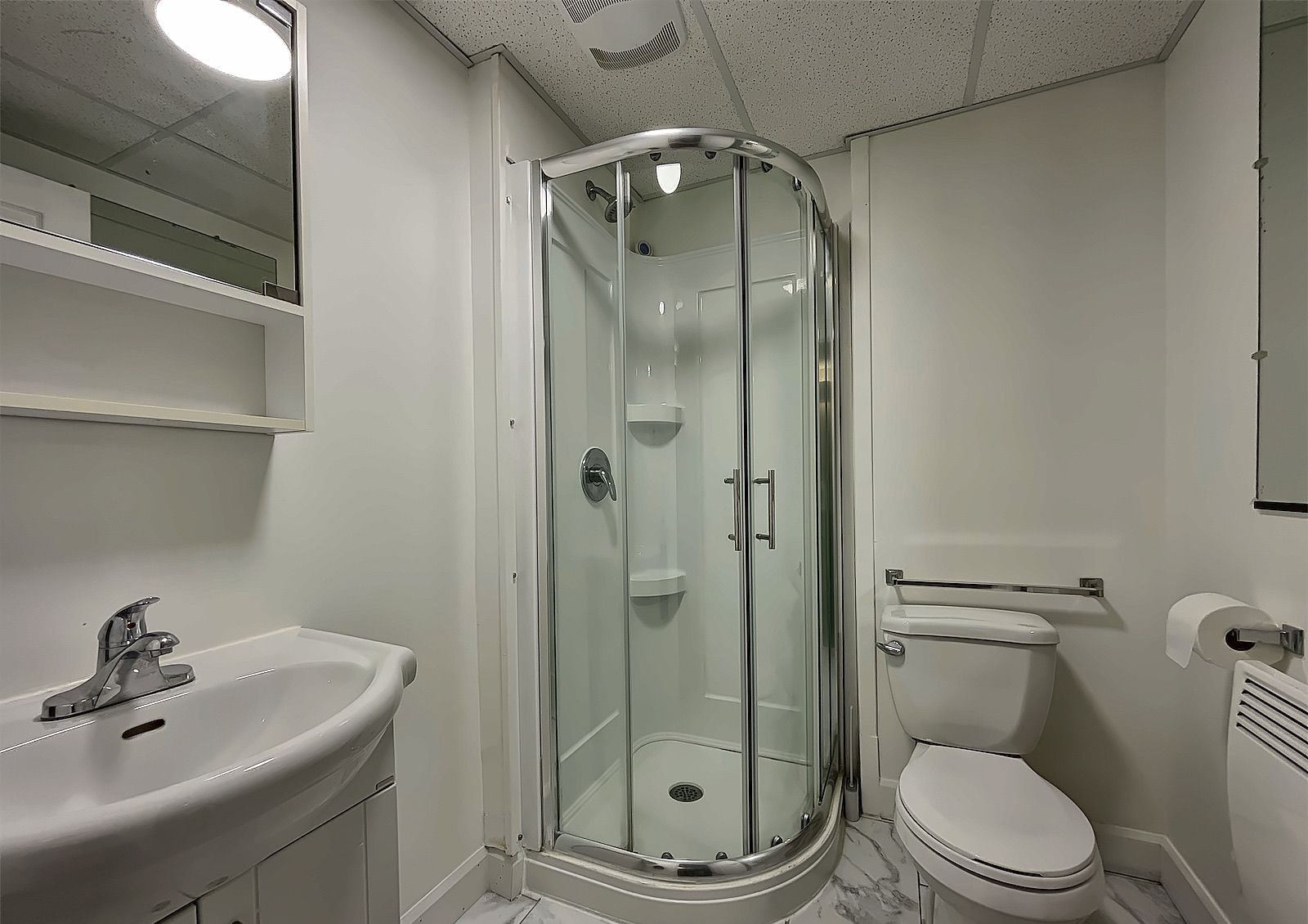 Le sous-sol est aménagé avec une salle de bain incluant une douche, un espace cinéma maison, une grande pièce polyvalente pouvant servir de chambre ou de bureau, un poêle à bois, un coin atelier ainsi que les installations pour laveuse et sécheuse.