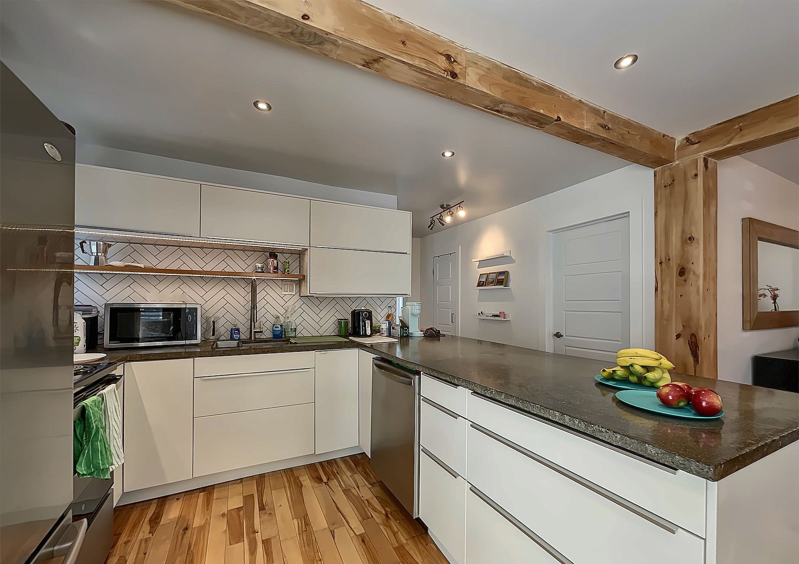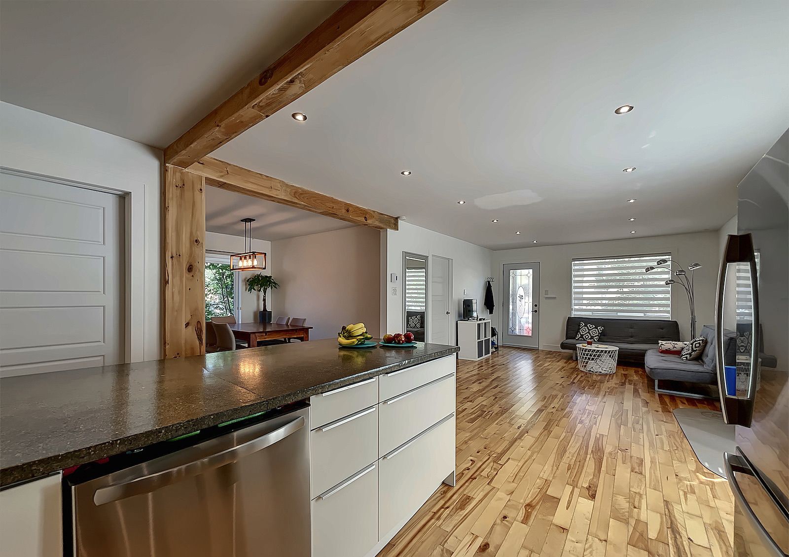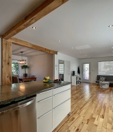 The downstairs unit, ideal for a homeowner, includes 2 large bedrooms with independent dining room and laundry room. Bathroom renovated in January 2023. Lots of windows with plenty of light all day. Exposed beams. Central vacuum. Heating and air conditioning heat pump for both rents. Outdoor shed and basement for additional storage. Slow combustion stove in the basement. Located at the end of a quiet cul-de-sac street.