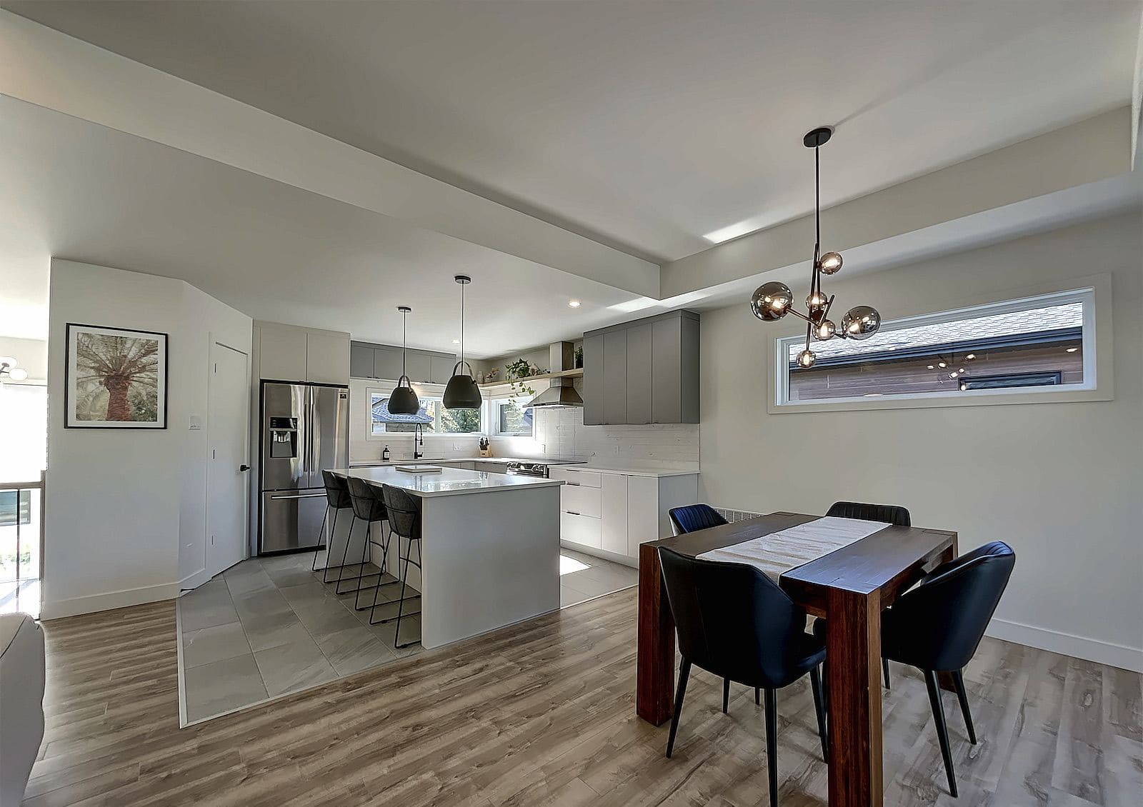 Cuisine contemporaine avec un très grand îlot en quartz, un garde-manger et un concept à aire ouverte offrant une luminosité exceptionnelle.