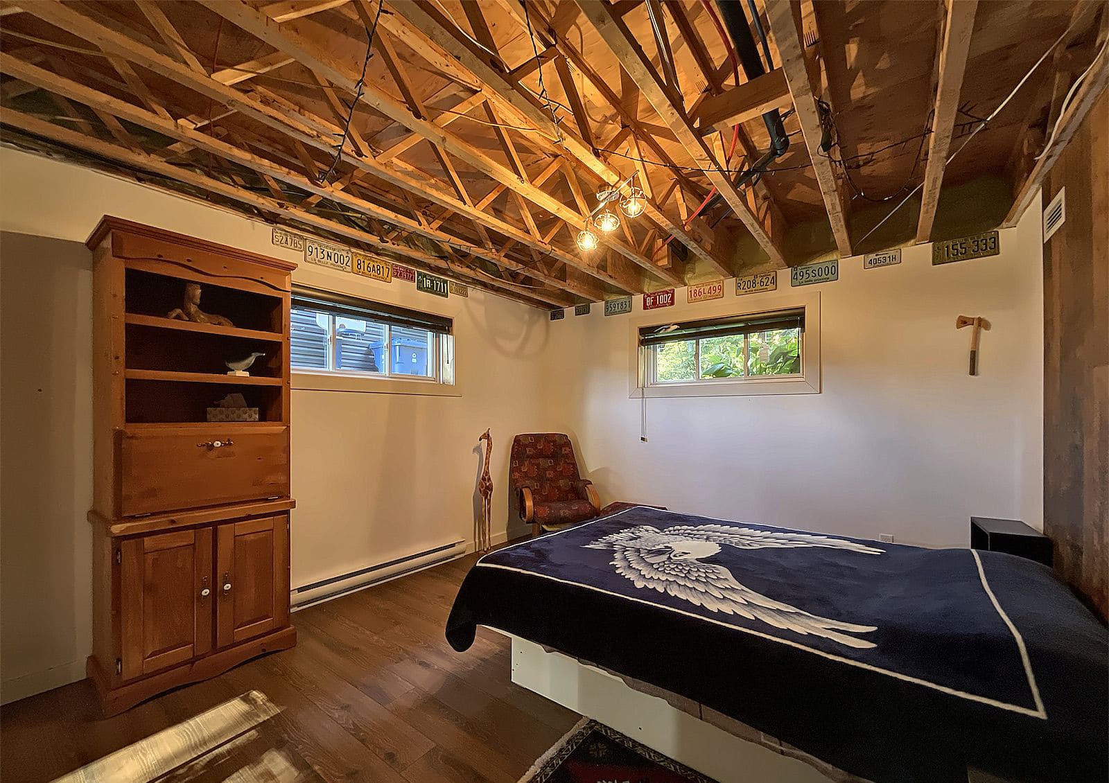 Garage 2 étages avec une grande apprentie à l'arrière offrant beaucoup de rangement.