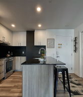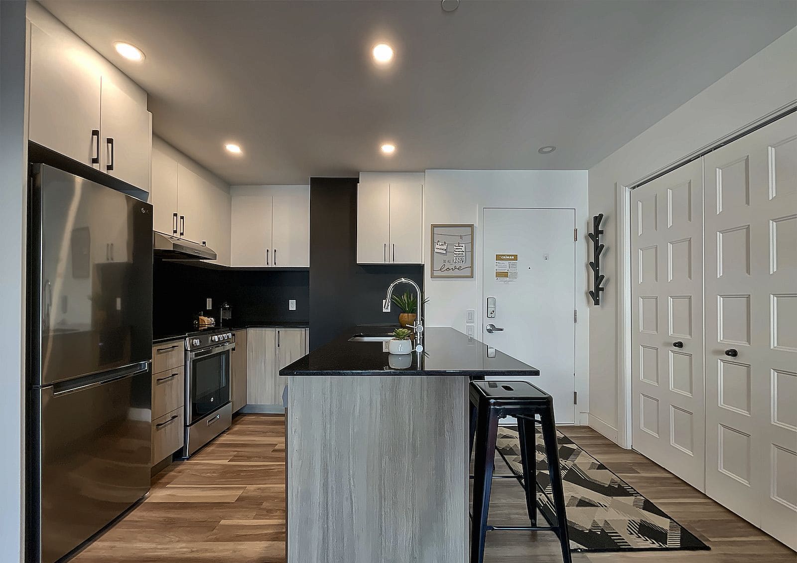 Cuisine moderne avec comptoirs de quartz, électroménagers haut de gamme inclus
